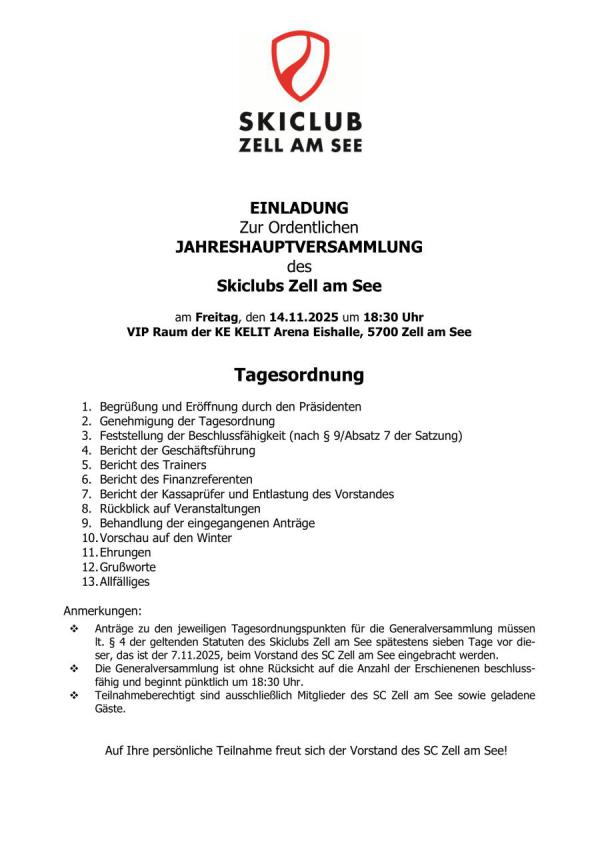 Sie sind hier: Aktuelles Aktuelles vom Skiclub Zell am SeE Jahreshauptversammlung 14.11.2025 Freitag 14.11.2025 18:30 Kelit Eis Arena
